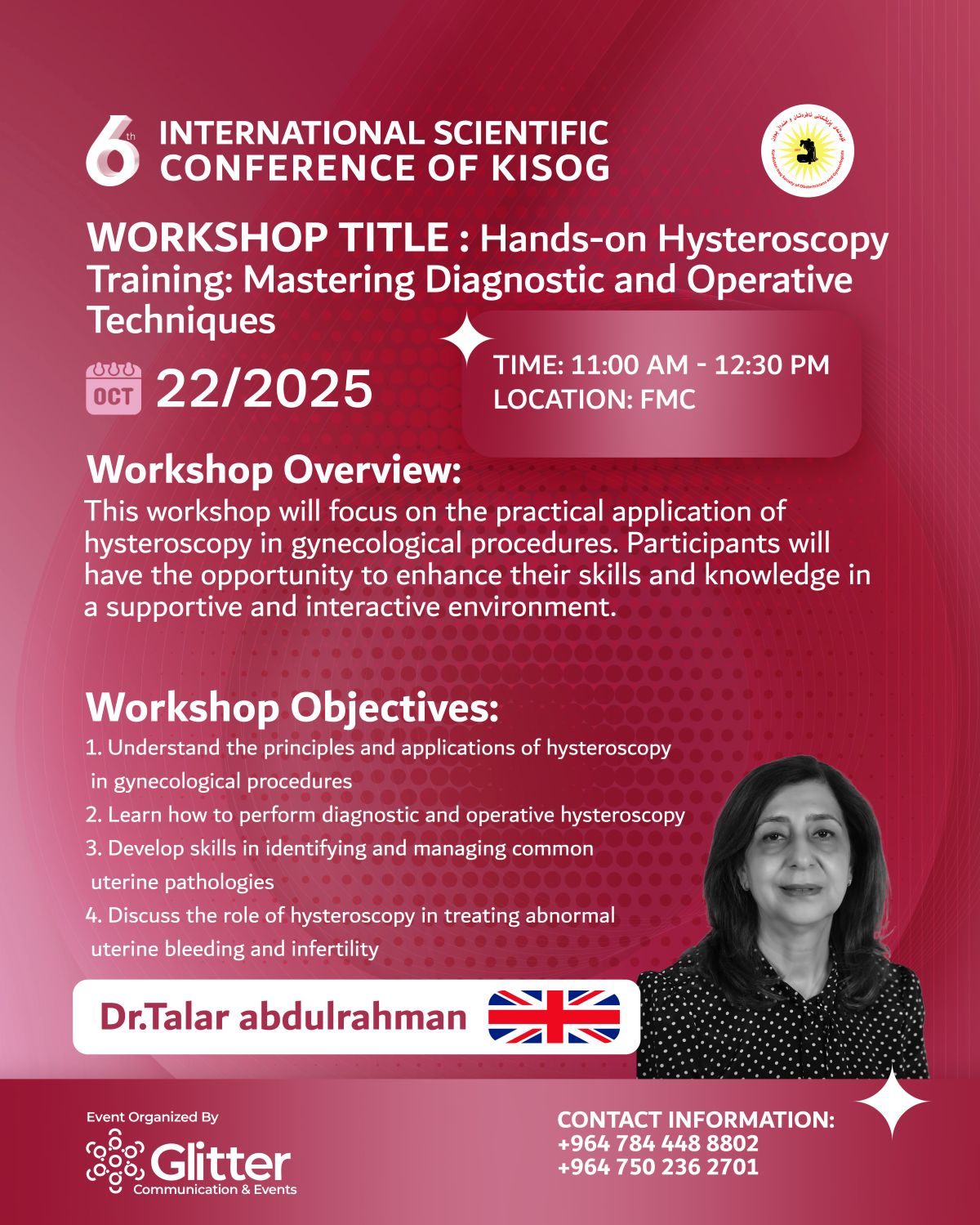 Join us for an intensive hands-on hysteroscopy training session, led by renowned expert Dr. Talar Abdulrahman. This workshop will focus on the practical application of hysteroscopy in gynecological procedures. Participants will have the opportunity to enhance their skills and knowledge in a supportive and interactive environment.
